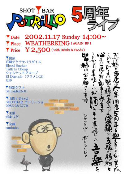 「ポトリージョ5周年ライブ」用のチラシで、いろいろな人の力を借りて作成しました。 まず、「ポトリージョロゴ」は以前お店に務めていた方のデザインをもとにプロが作ったというイラストレーターデータ。微妙なラフさとカラーリングが絶妙です。「5周年ライブ」の文字はそのロゴの雰囲気に似せようとイラストレーターで文字を崩したのですが、カクカクと曲がっているだけなので、今となっては完成度を落としている最大の原因だと思います。「筆文字」はマリンクラブで書道を教えていらっしゃる先生にお願いして書いていただいたものを、部分ごとにスキャンしたもの。黒い所だけを切り抜いて背景に馴染ませるのにはフォトショップが威力を発揮(さほど難しくありません)。ちなみにこの作品は○万円をかけて表装されライブでは会場入り口でお客様を出迎えたほか、お店に飾る予定だとか。似ていると評判だった「松ちゃんイラスト」は原画をメンバーの領家氏が描きました。彼のほのぼのとしたタッチには定評がありますが、色鉛筆でラフに描いたものだったため、チラシ映りを良くするため私の友人で千葉在住の土井ちゃんに手直しを依頼。原画の雰囲気をそのままに、焼き直しをしてくれました。 というと「5周年ライブ」以外に私がやったのは他の文字と背景だけなのですね。ただし、「レンガ」は店にある本物をデジカメで撮って、イラストのタッチに似せるようにフォトショップで加工したレンガのパーツを10個くらい作りましたので、割と時間は使ってます。 5周年ライブということで、プロに任せたようなちゃんとしたチラシをイメージして作ったんですが、やはり手作りの域を超えることはできませんでした。いろいろと反省点が見えてきていますので、次回につなげたいと思います。 しかし、製作にいろんな人が携わったという点は、なんかプロっぽいので好きです。ご協力いただいた皆様、本当にありがとうございました。 |