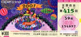 | 4日午前8時頃、和田夫妻が昨年大晦日に抽選が行われた年末ジャンボ宝くじのチェックをしていたところ、新世紀の特別枠である「さようなら20世紀賞」に当選していることがわかった(写真)。この賞は各組共通の下4ケタとなっており、合計3組が用意されていた。この各組共通の4ケタは通常の4等に相当し1万円の設定であるが、和田家の当選した「さようなら20世紀賞」は5万円となっている。仕事始めの日ぐらい余裕を持って出勤しようと考えていた夫は、この思わぬハプニングにより遅刻しそうになったという。 |