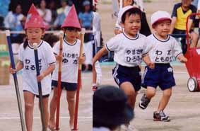 | 今月7日、大勢の父兄が見守る中、大淀幼稚園の運動会が盛大に開催された。プログラムの1番は全園児によるかけっこ。幼稚園でも1、2を争うおチビさんの倫典に両親はスタートのタイミングを教え込んだものの、肝心の競争心が全く芽生えておらず、楽しそうに駆けた結果は4人中4位(写真右)。一方の陽花はスタート直後に隣を走る女の子と仲良く転倒したが、2人ともすぐに起きあがり走り切った。結果は4人中3位だったが、恐らくこけてなくても順位は変わらなかったとみられる。その後のリズム体操や親子での障害走などでは、子供よりも母親がハッスルしていた感があったが、最も感動を呼んだのは陽花が年長児障害走で披露した竹馬。本番に向けてかなりの練習を積んだことは両足の指のマメがつぶれていたことでも判っていたが、本番では見事一度も足を付ける事なくゴールした(写真左)。父親は「カメラのファインダーの中では美しい動きがスローモーションで見え、一所懸命練習している姿とオーバーラップした。私は奇跡を目にしたのだ。」と信じられないくらい大袈裟なコメントを残しており、自分だけが気付いていない親バカぶりはしばらく続きそうだ。 |