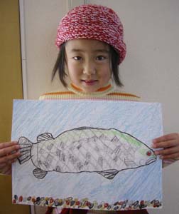 | この度、宮崎市の大淀川学習館が主催する「第8回大淀川流域の動植物コンクール」で和田倫典くん(4つ)の作品(写真)が幼児の部で佳作に入選した。この絵が描かれたのは昨年の夏で、倫典くんの姉で江南小学校1年の陽花ちゃんが夏休みの宿題のひとつの絵画を描くために大淀川学習館を訪れた際に同行し、描かれたもの。同館ではその頃、市民から寄贈された大きなアカメが話題となっており、その大きさや目の赤さに興味を覚えた子供達は、それらを絵画の題材に選んだ。悠々とした泳ぎっぷりで、比較的描きやすかったと言えるが、やはり動くものを描くのには四苦八苦した。姉と共に1時間足らずで描きあげた作品は互いの影響が見られ、非常に似ている。姉はその作品を持ち帰り学校に提出し、倫典くんはその場で出品した。待つこと4ヶ月、昨年12月になって同館から文書と共に賞状と記念品が届き、一家を驚かせた。記念品がクレヨンだったこともあり、今後同種のコンテストにも挑戦していきたいと語っているのは倫典くんではなく父親のようである。 |