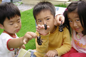 | 昨年に引き続き、和田家は今年もカブト虫とクワガタをゲットした。捕獲作戦が行われた夜、一家は昨年たくさんのカブト虫を捕まえた実績のある国富町に8時過ぎに到着。一帯を家族で捜索したが、時間が早すぎたのか、1匹も捕らえることはできなかった。がっかりした子供達は帰りの車の中で眠ってしまい、どうにもバツの悪い両親は、ダメでもともとと昨年あまり捕まえることのできなかった宮崎市内のはずれに向かった。10時頃到着しライトを照らすと、そこには黒い物体が樹液の周りにひしめき動いていた。父親は子供を起こすのも忘れ、網を抱えて一目散に車から飛び出すと夢中で捕った。子供達に捕まえさせることはできなかったが、カブト虫のオスが2匹とクワガタのオスが2匹というまずまずの収穫に両親はホッとした。その後、味を占めた父親は頼まれてもいないのに何度か足を運び、数を増やし喜んだが、このことで後日、虫達の世話を巡って父親が不利な立場に追いやられようとは知る由もなかった。なぜか家の虫カゴの上に自分から飛んで来たものを含め、多い時で13匹飼っていたが、徐々に死んでいった。ちなみに、先日の台風10号の時すら中に入れてもらえなかったタフな生き残りは、カブト虫のオスとメスが各4匹、クワガタのオスが2匹。先日、土の中からカブト虫の卵と見られる白いものが3個発見され、別の容器に移された。カブト虫を卵から育てた経験は父親もないため多少の不安は残るものの、冬を越すと言われているクワガタと共に、一家は協力して飼育することを誓った。順調に育った場合に限って、また本紙面で紹介することにする。 |