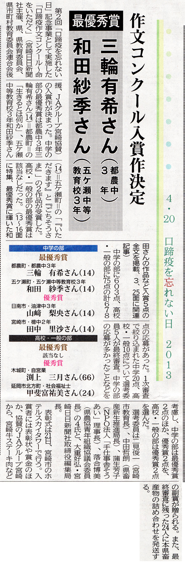 平成25年4月20日 宮崎日日新聞(口蹄疫を忘れない日 作文コンクール:和田紗季)